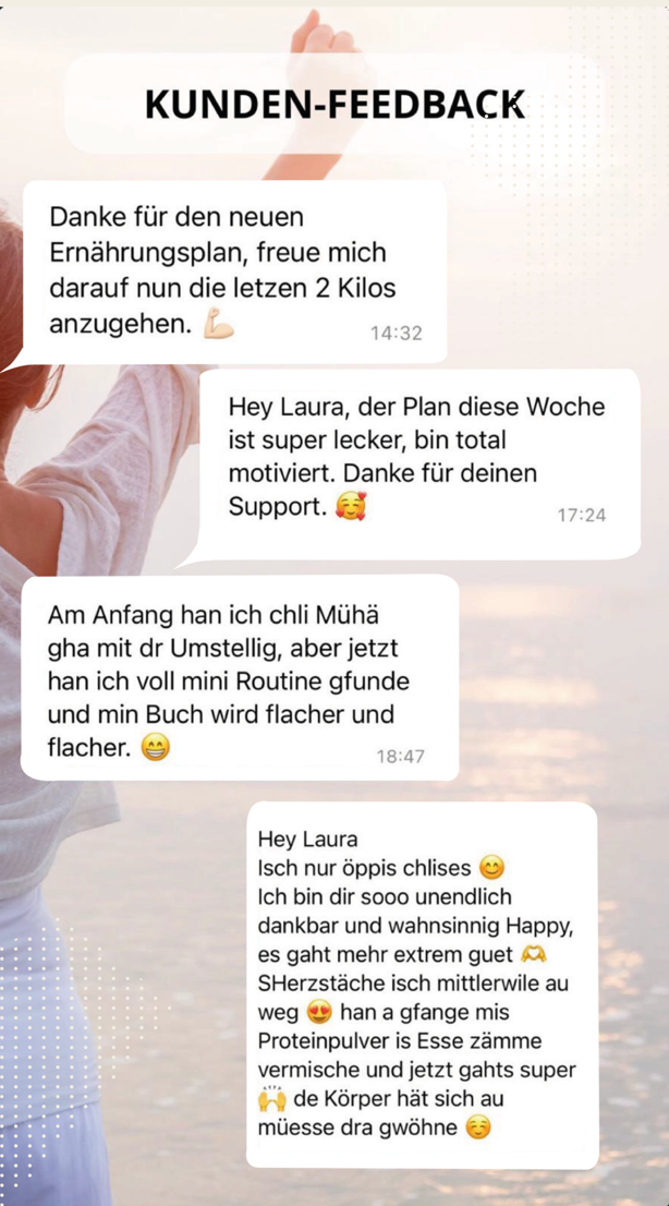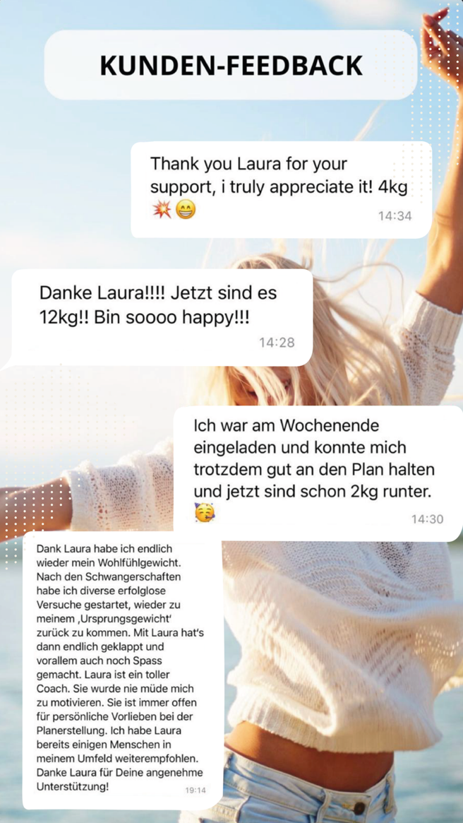 Nach meinen Schwangerschaften habe ich einige Male erfolglos versucht, zu meinem Ursprungsgewicht zurückzufinden. Mit Laura hat es super geklappt und dabei immer Spass gemacht.